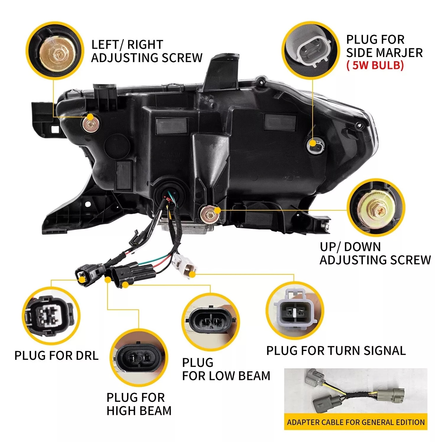 Functions: White LED Start-up Animation Running light/White LED DRL, Yellow LED Sequential Turn Signal, Clear LED Side Mark light, High Low Beam: Full LED, No Need Bulbs